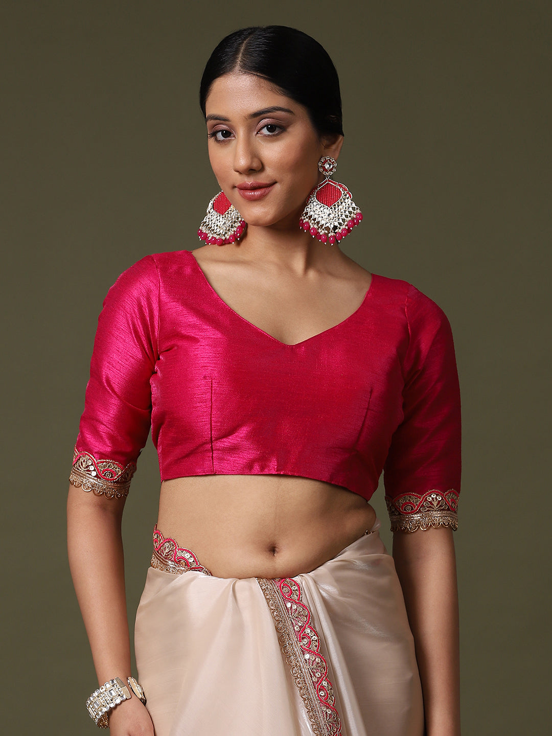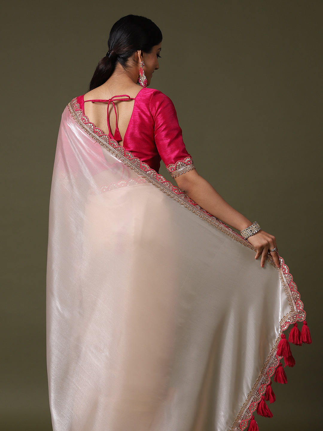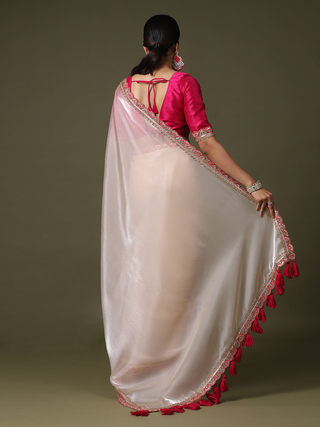 Ivory Organza Silk Saree with Embroidered Border & Rani Pink Blouse