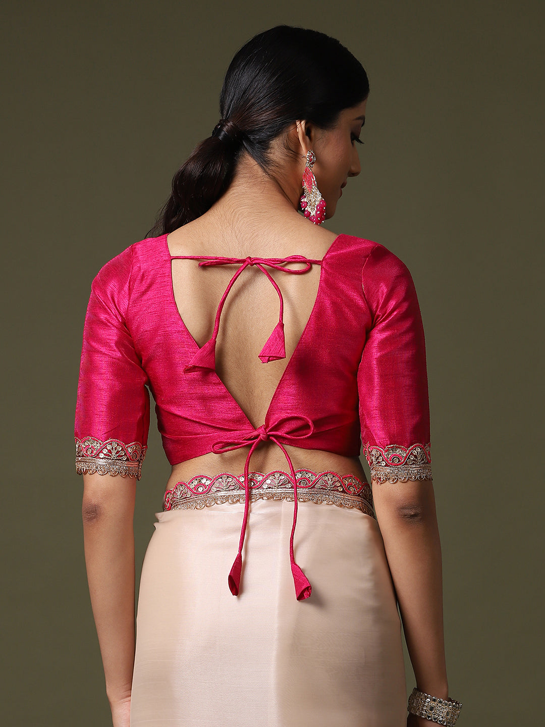 - Border: Intricate gold & rani pink embroidered scallop border running along all edges