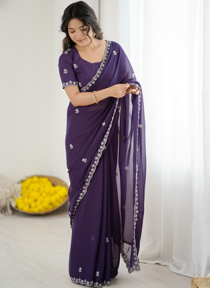 Imagine wearing this to a wedding reception, a festive puja, or a family celebration — the deep royal purple radiating quiet, magnetic power, the scattered silver blooms catching the light softly, the embroidered vine border framing every drape with grace.