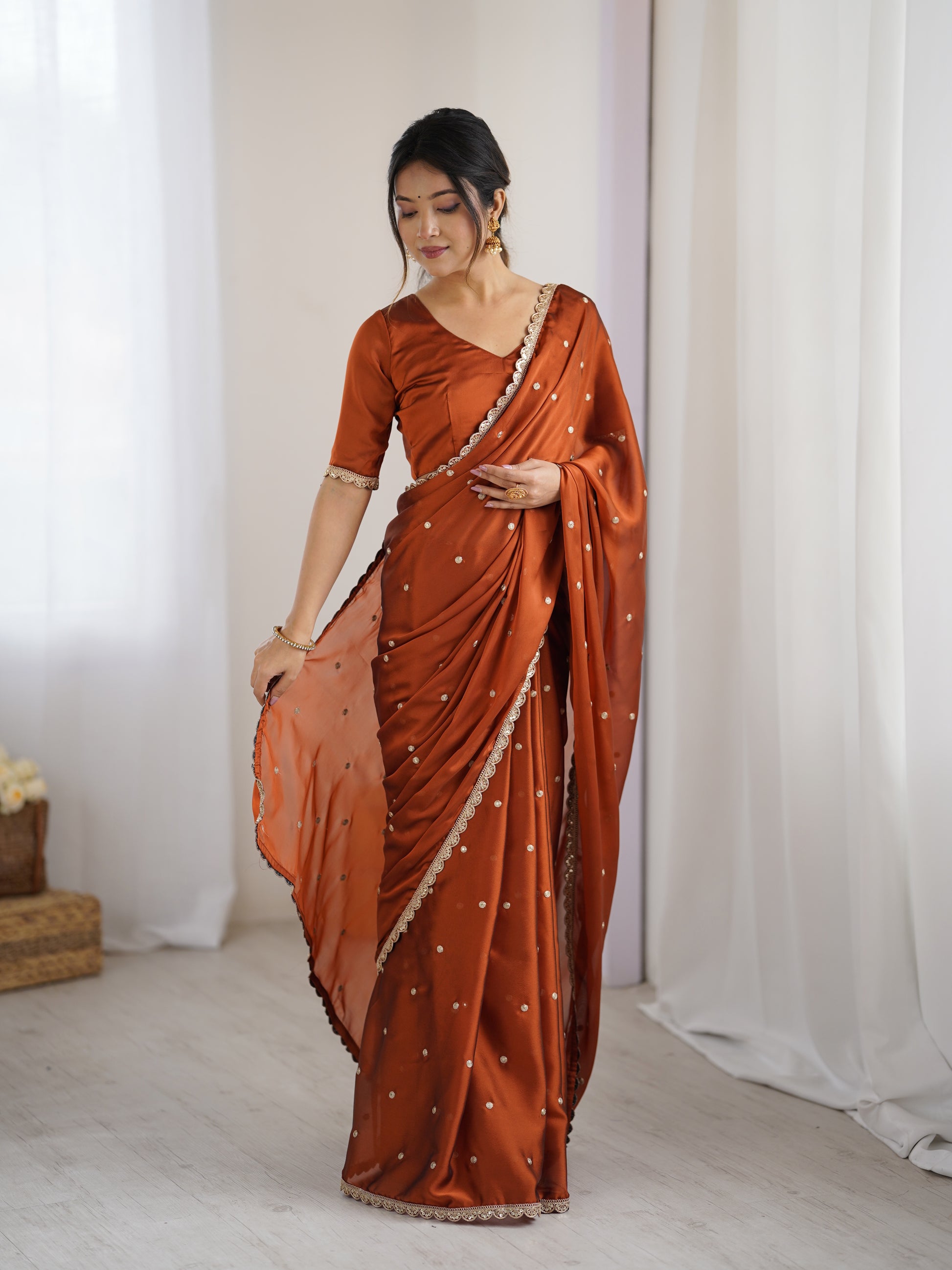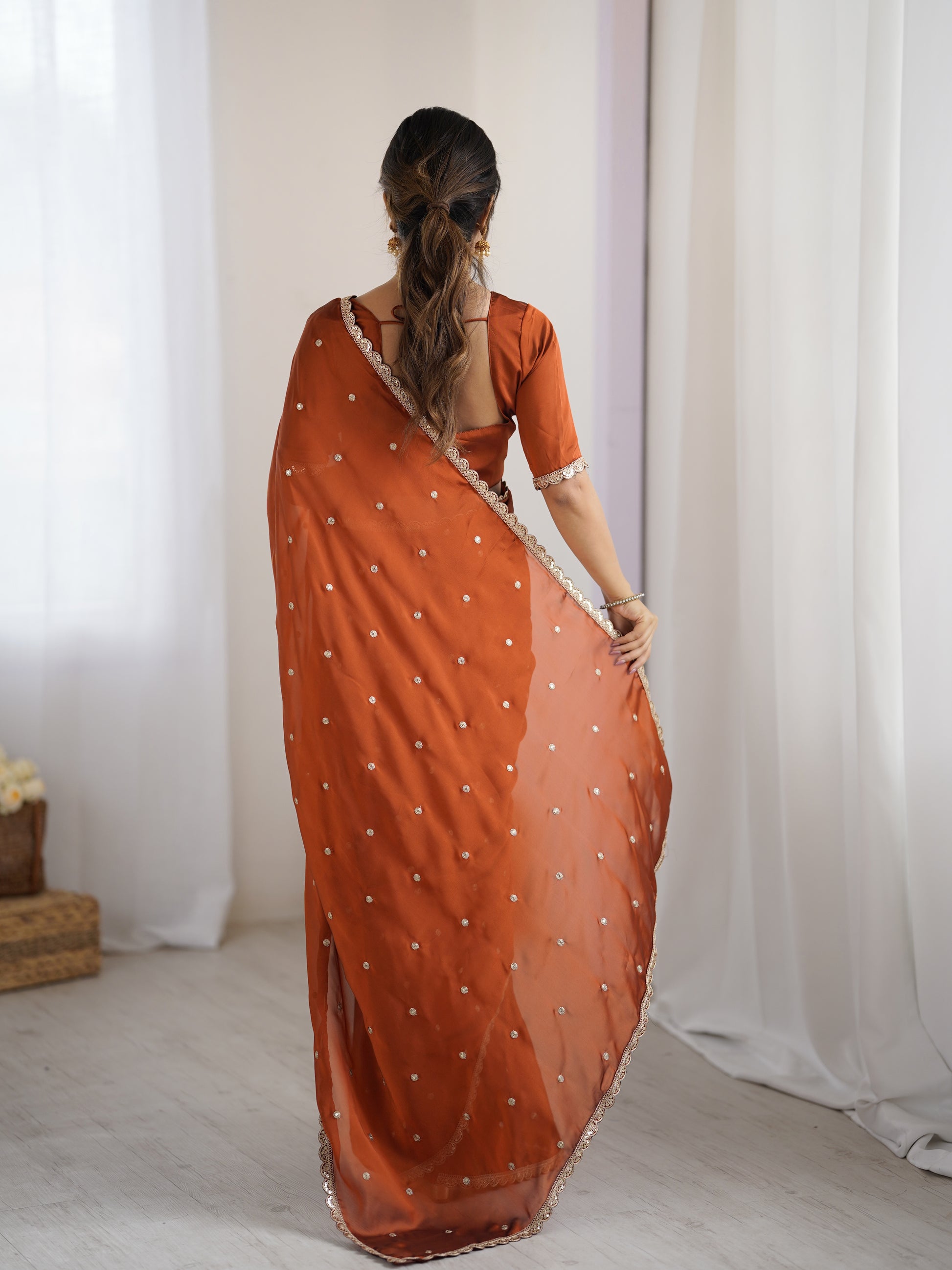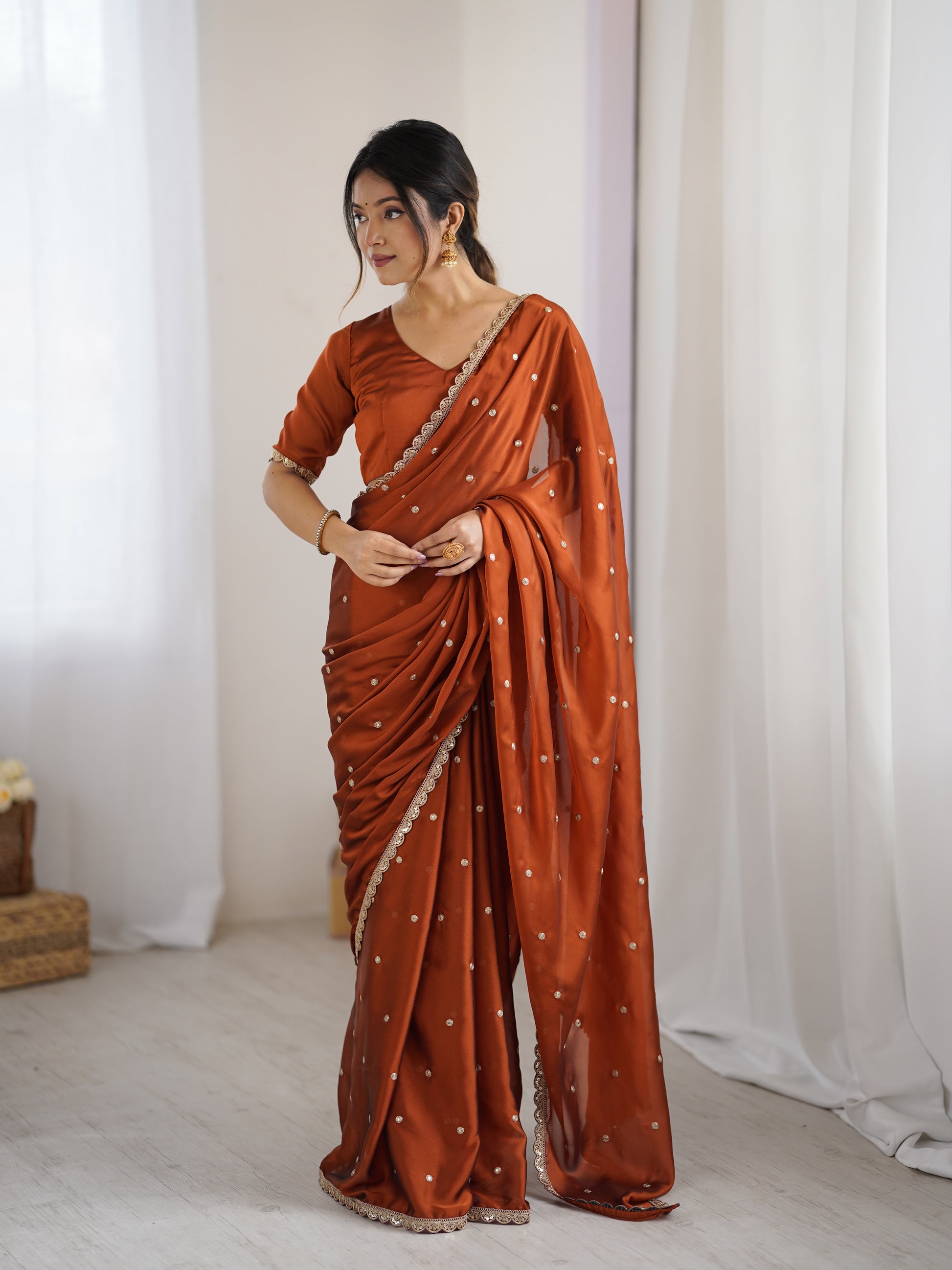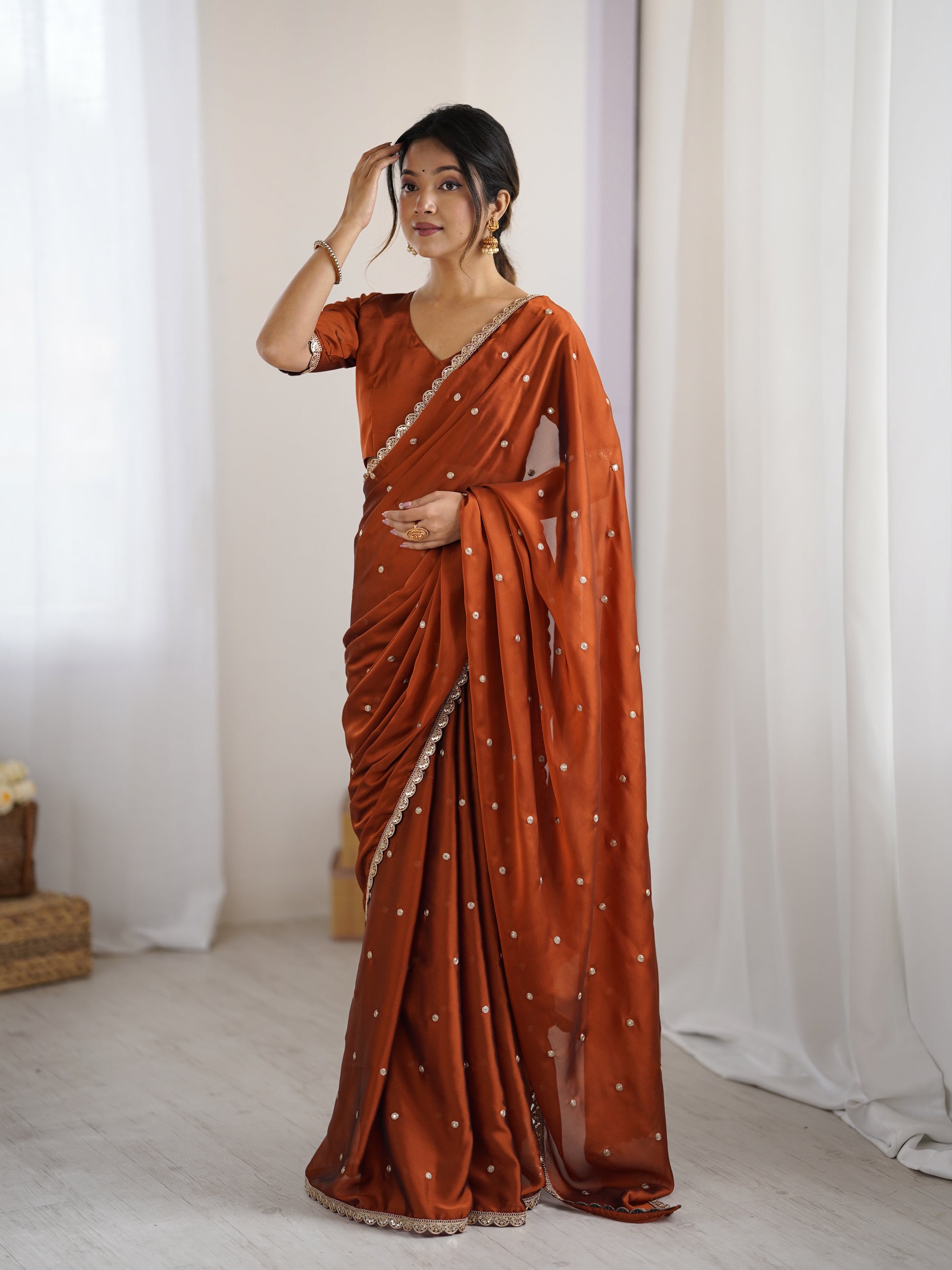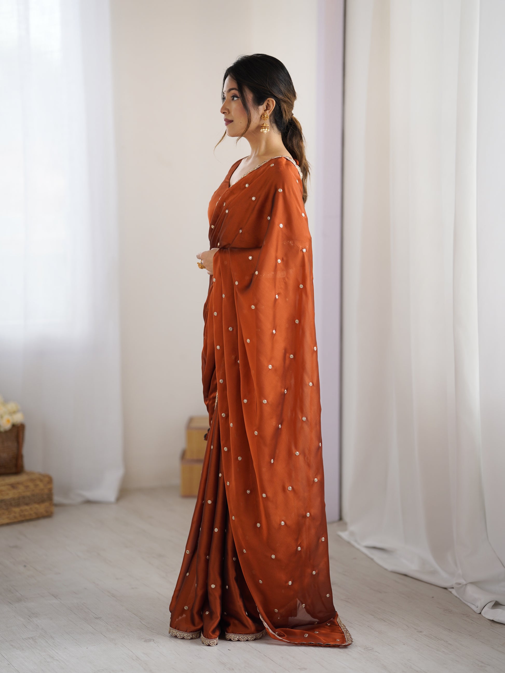 Draped in the warmth of rust, the Radha saree is a celebration of timeless femininity. Crafted in a luxurious satin-finish fabric, this rich terracotta-rust saree is adorned with delicate gold coin embellishments scattered across the drape — each one catching the light as you move.
