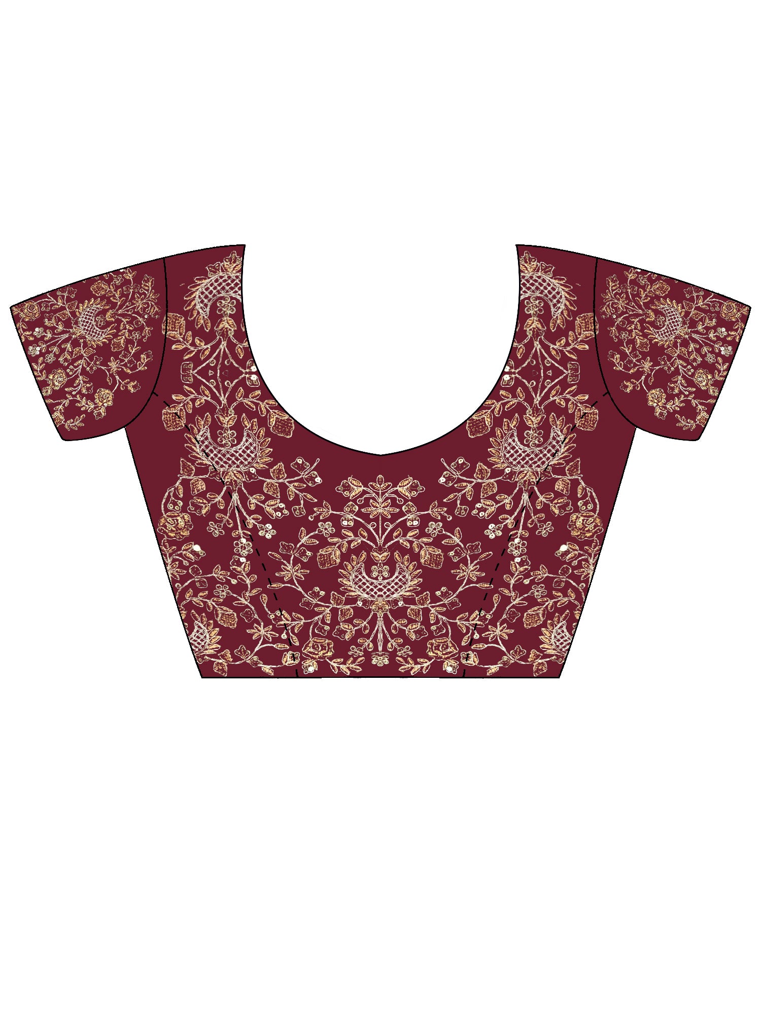 • Blouse: Fully embroidered with dense floral zari motifs, round neck