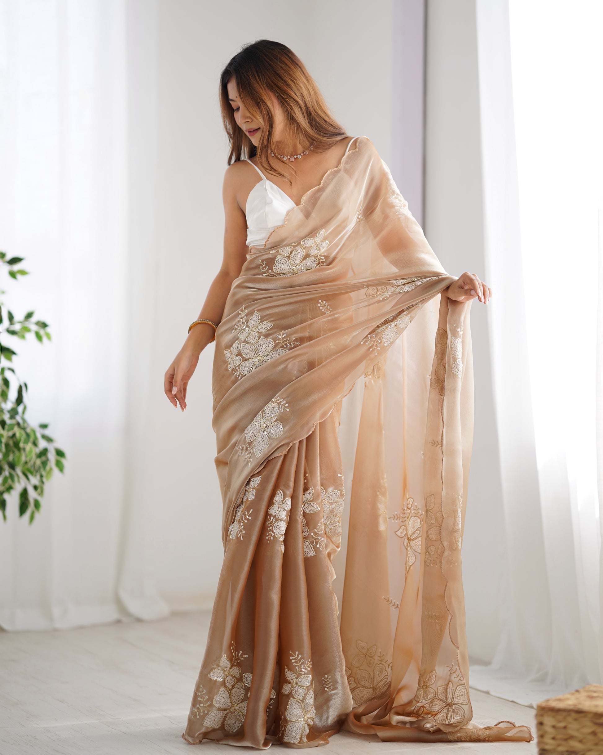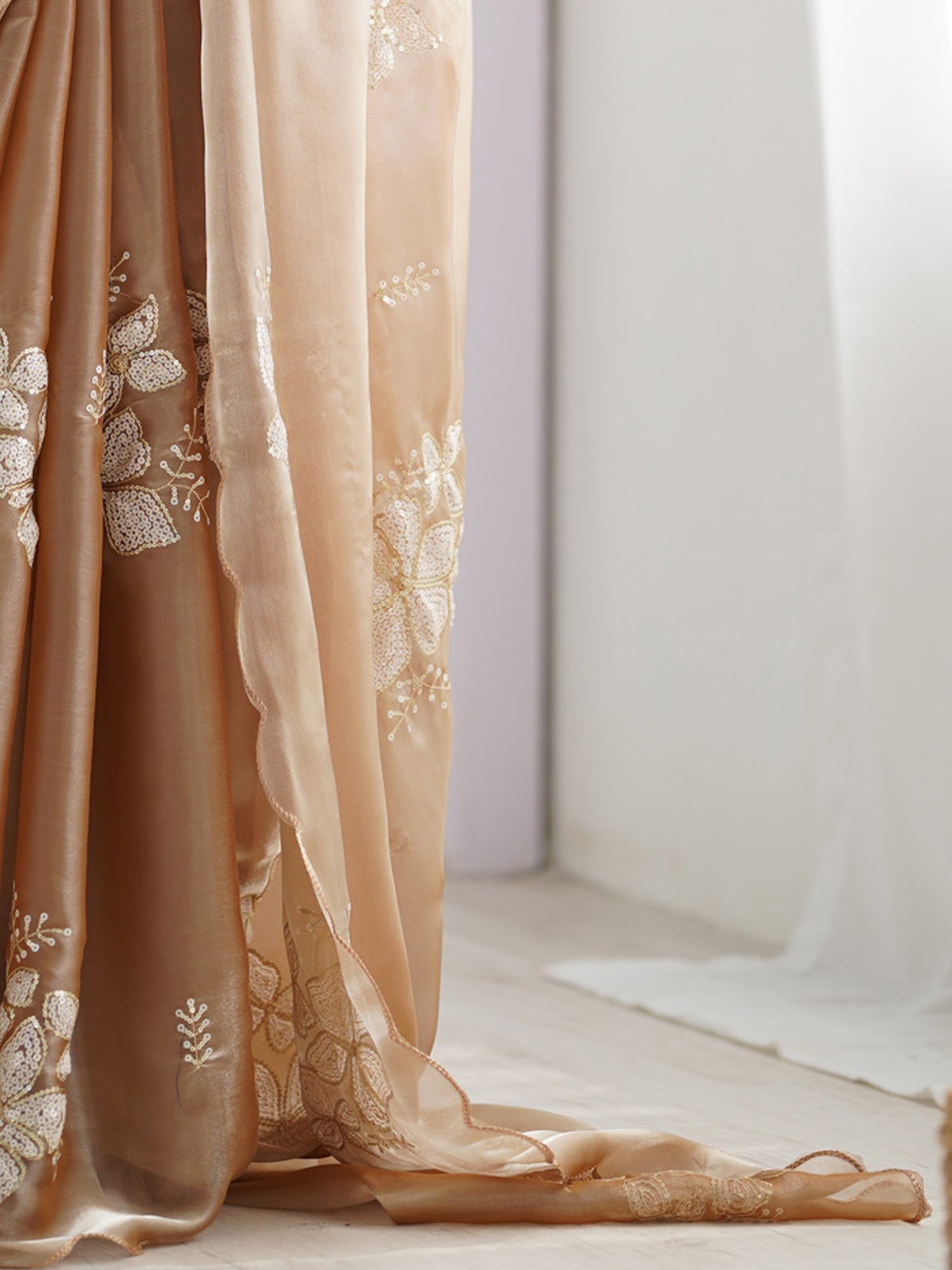 - Embroidery: Floral motifs in ivory and gold thread & White Sequins Work