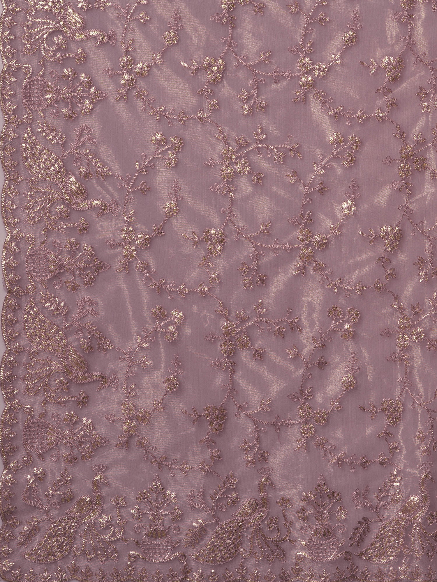 - Work: All-over floral, vine & peacock motifs in gold-silver thread