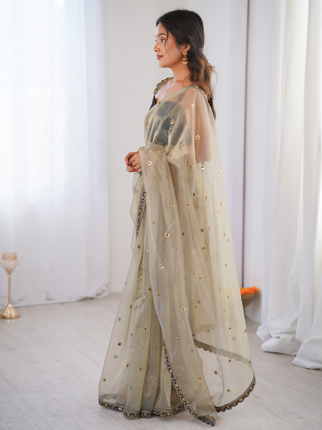 Woman wearing a beige saree with a white background
