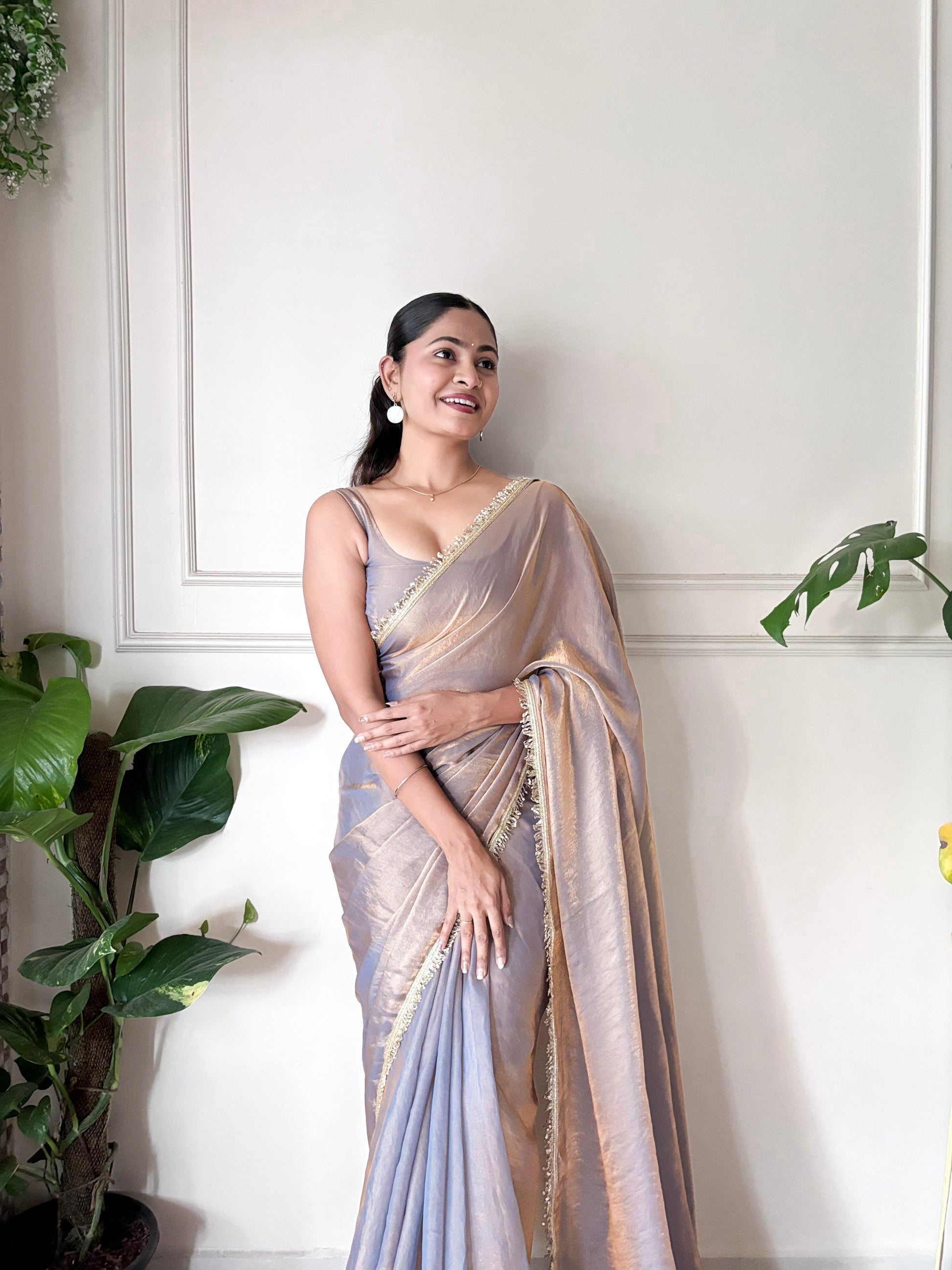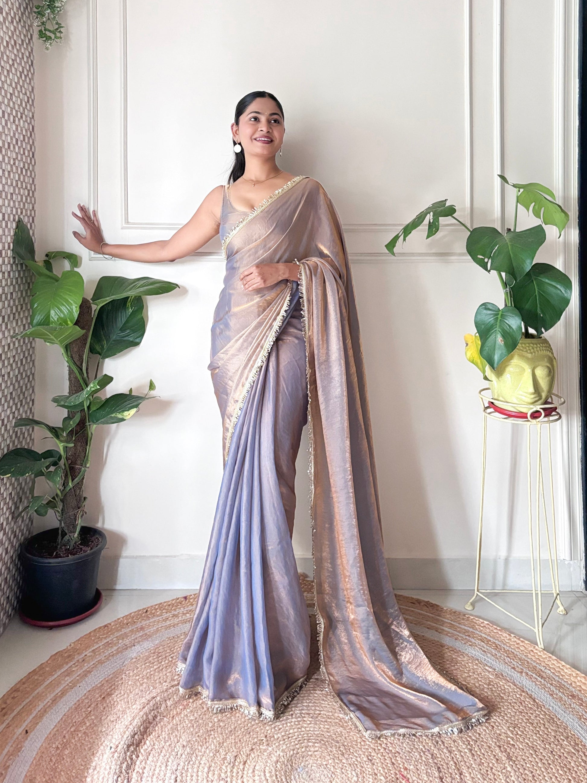 • Border: Delicate gold lace fringe border along the pallu and hem