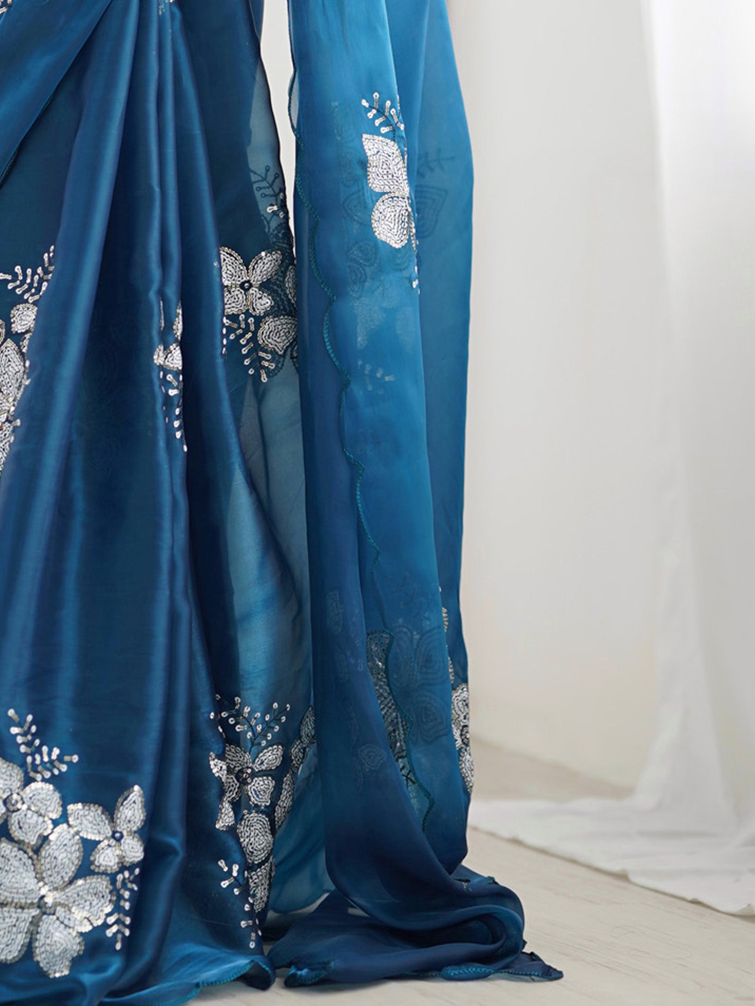 Drape yourself in the poetry of blooms with this stunning teal organza saree, adorned with intricate silver floral embroidery and sequin work. The sheer, lightweight organza fabric catches the light beautifully, while hand-crafted floral motifs scattered across the drape lend it an ethereal, garden-party charm.
