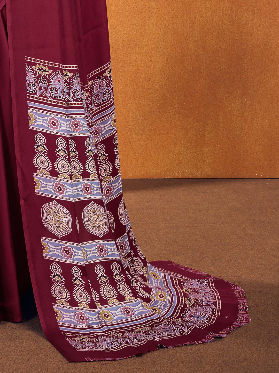 Deep Wine Satin-Silk Saree with Ajrakh-Motif Pallu & Full-Sleeve Printed Blouse