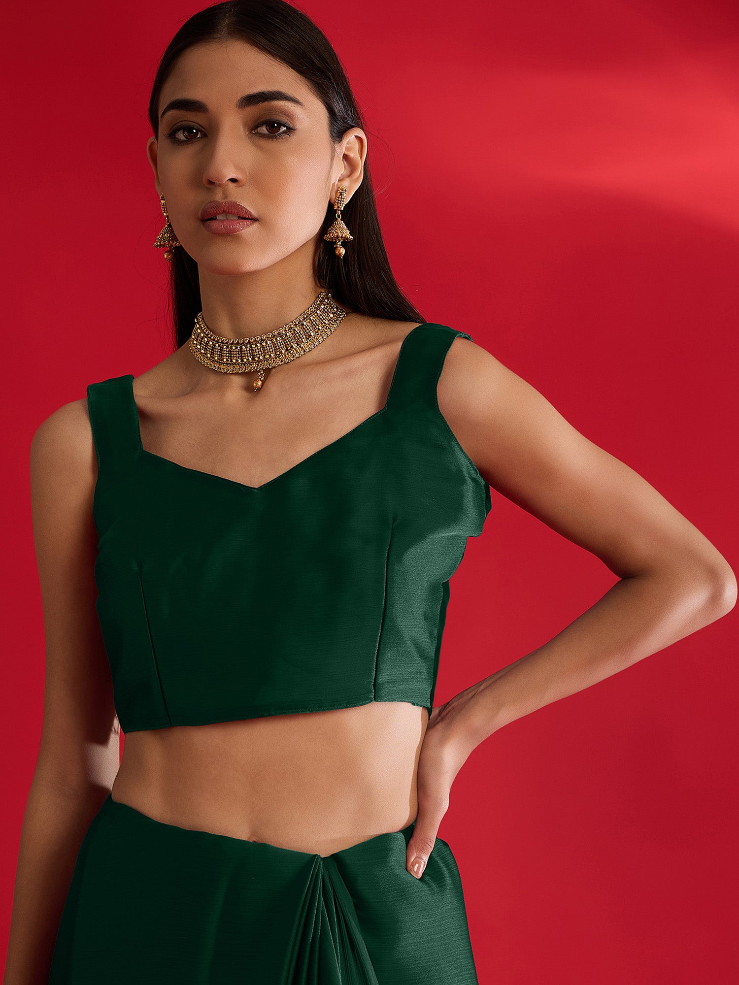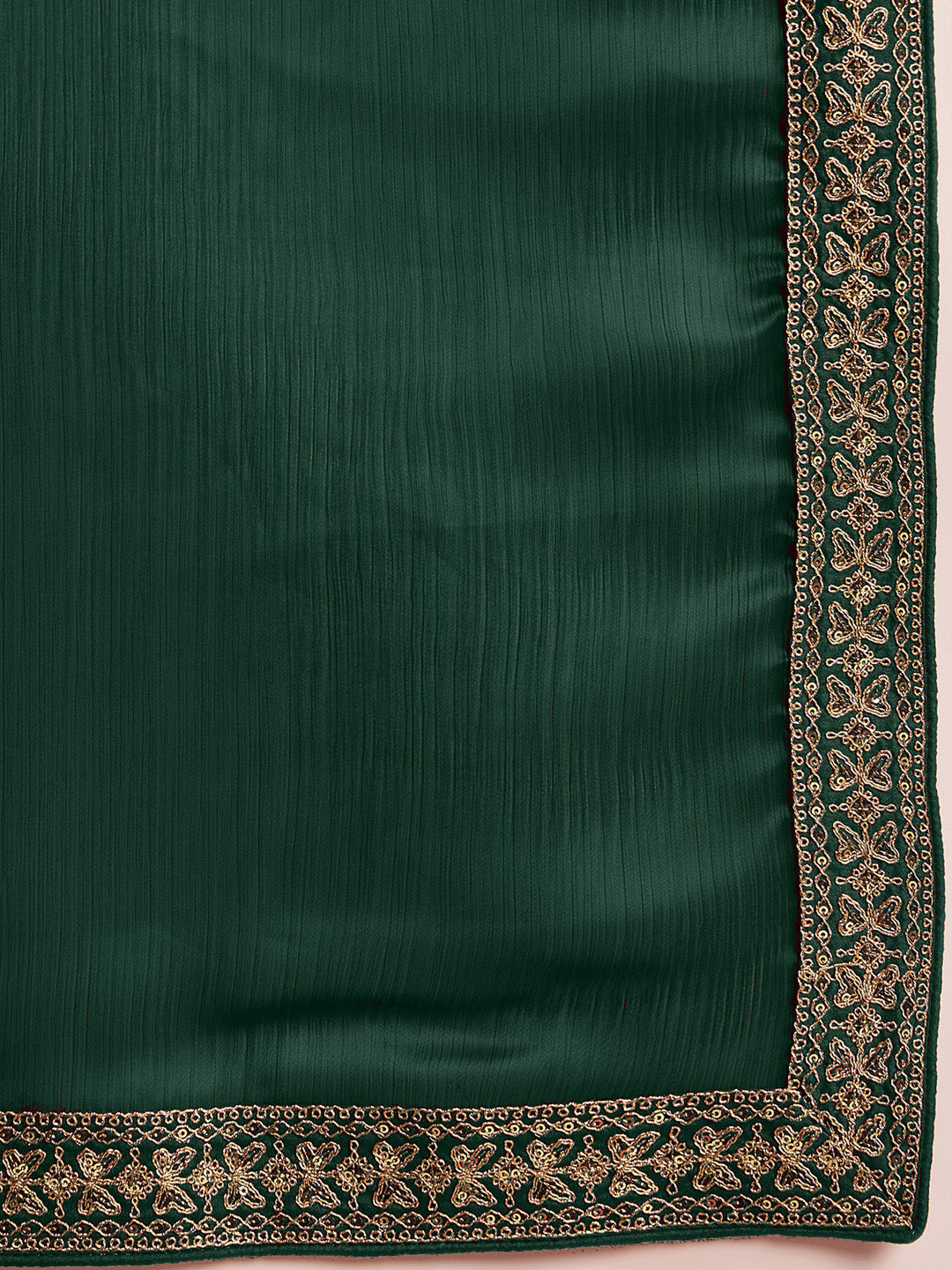 Emerald Green Satin Chiffon Saree with Gold Zari Border