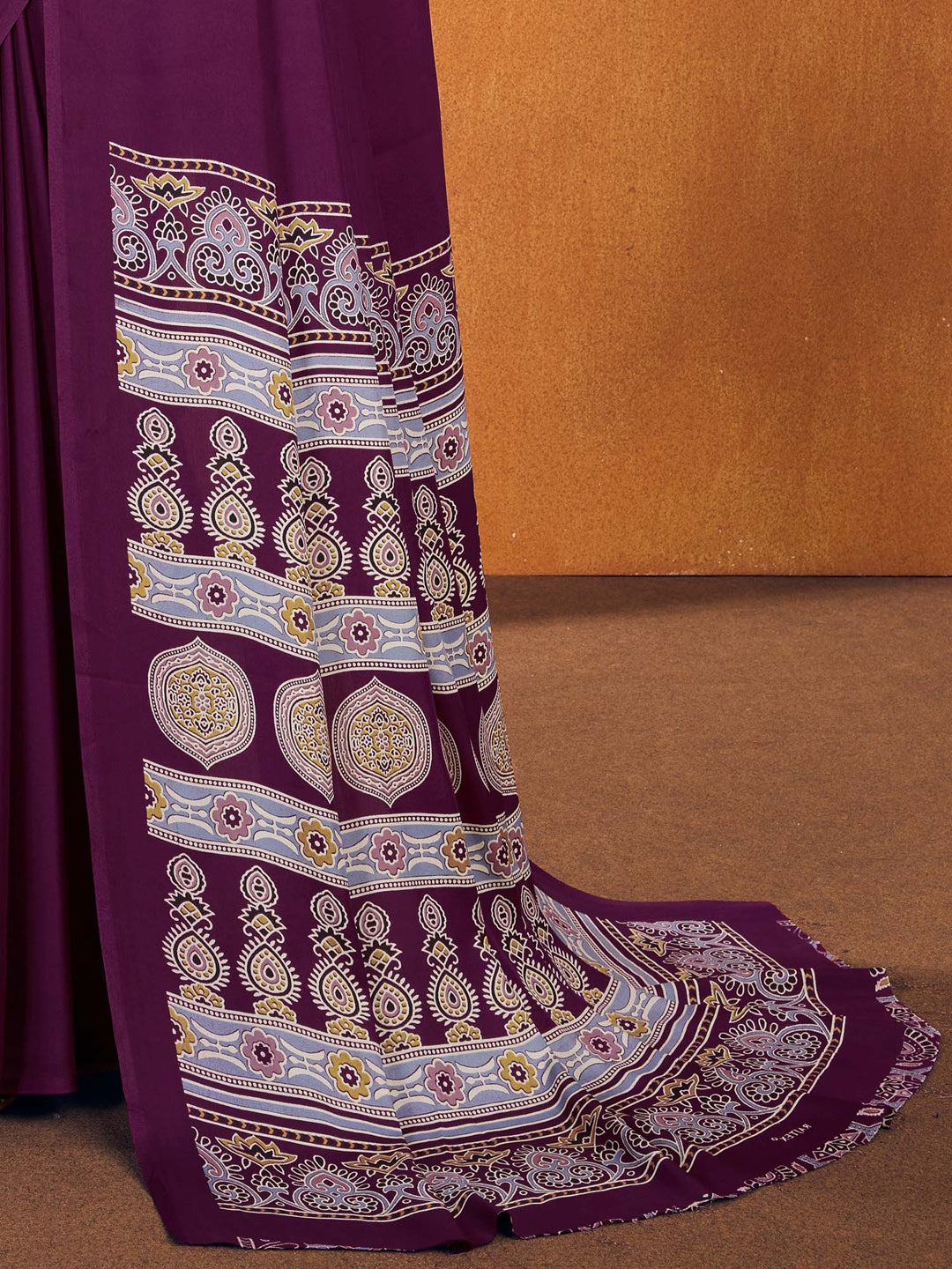 Wine Heritage Print Satin Silk Saree