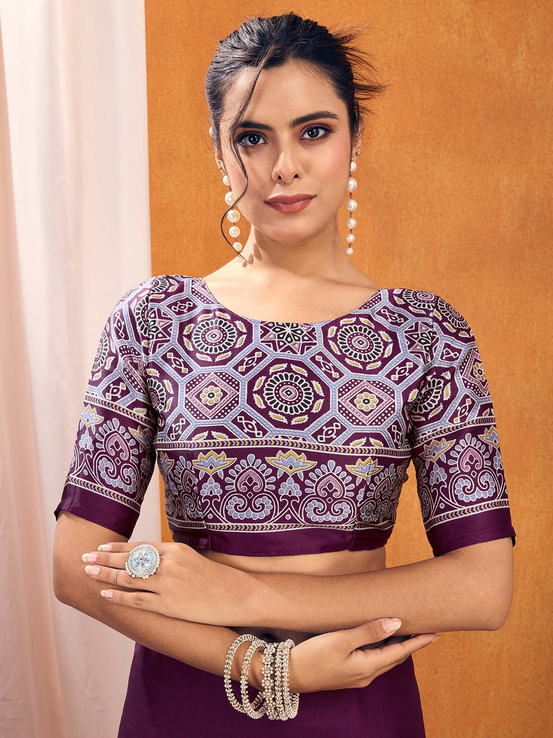 - Blouse: Deep wine satin silk printed blouse piece