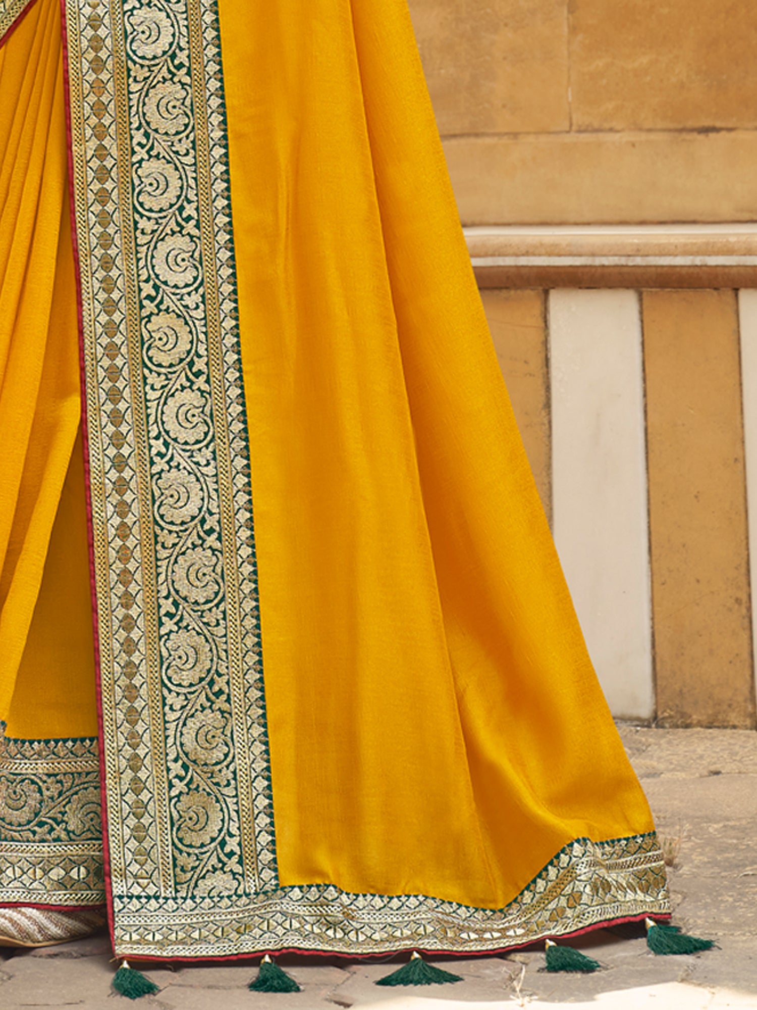 - Pallu: Heavily embellished Banarasi pallu with matching floral jaal and green tassels