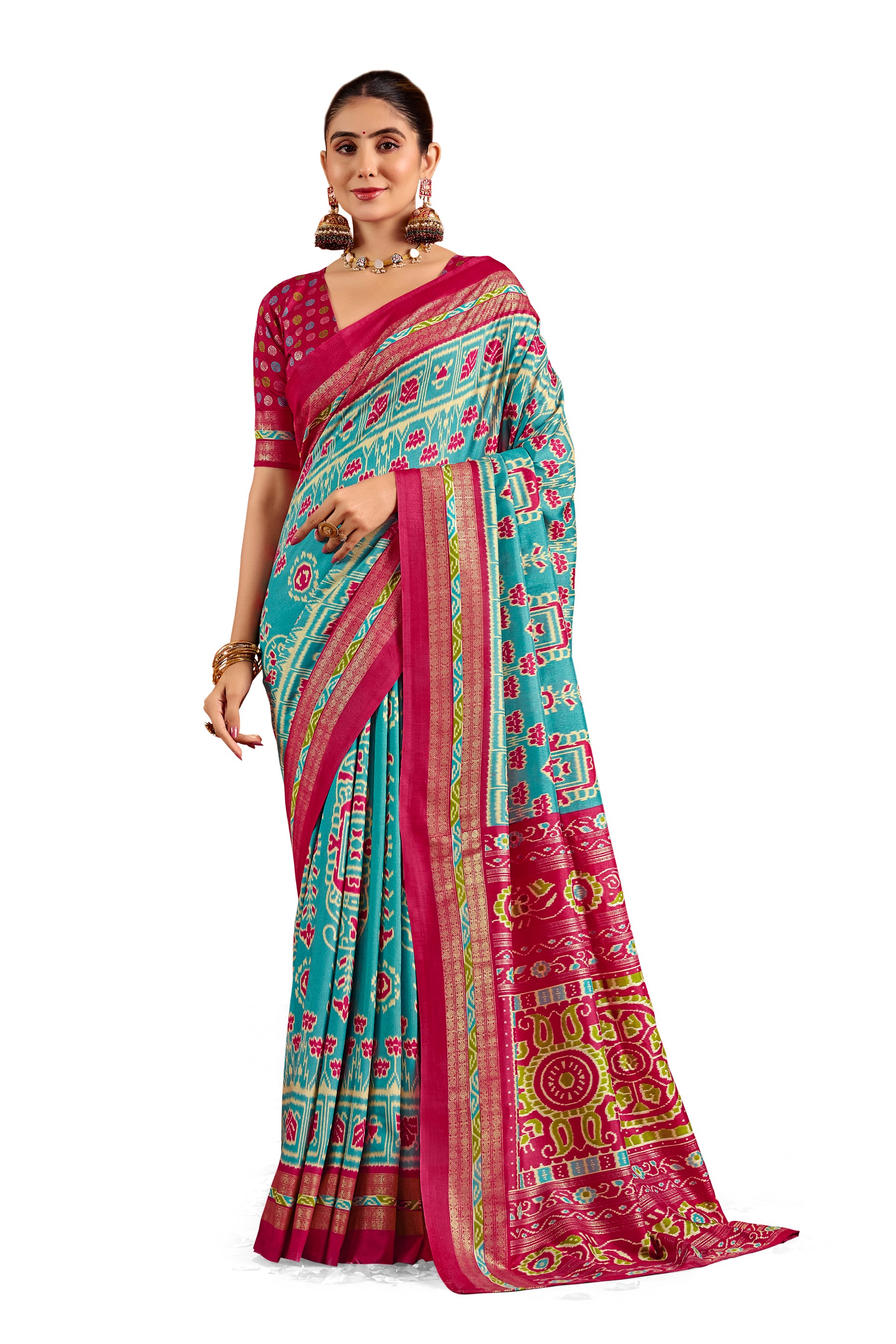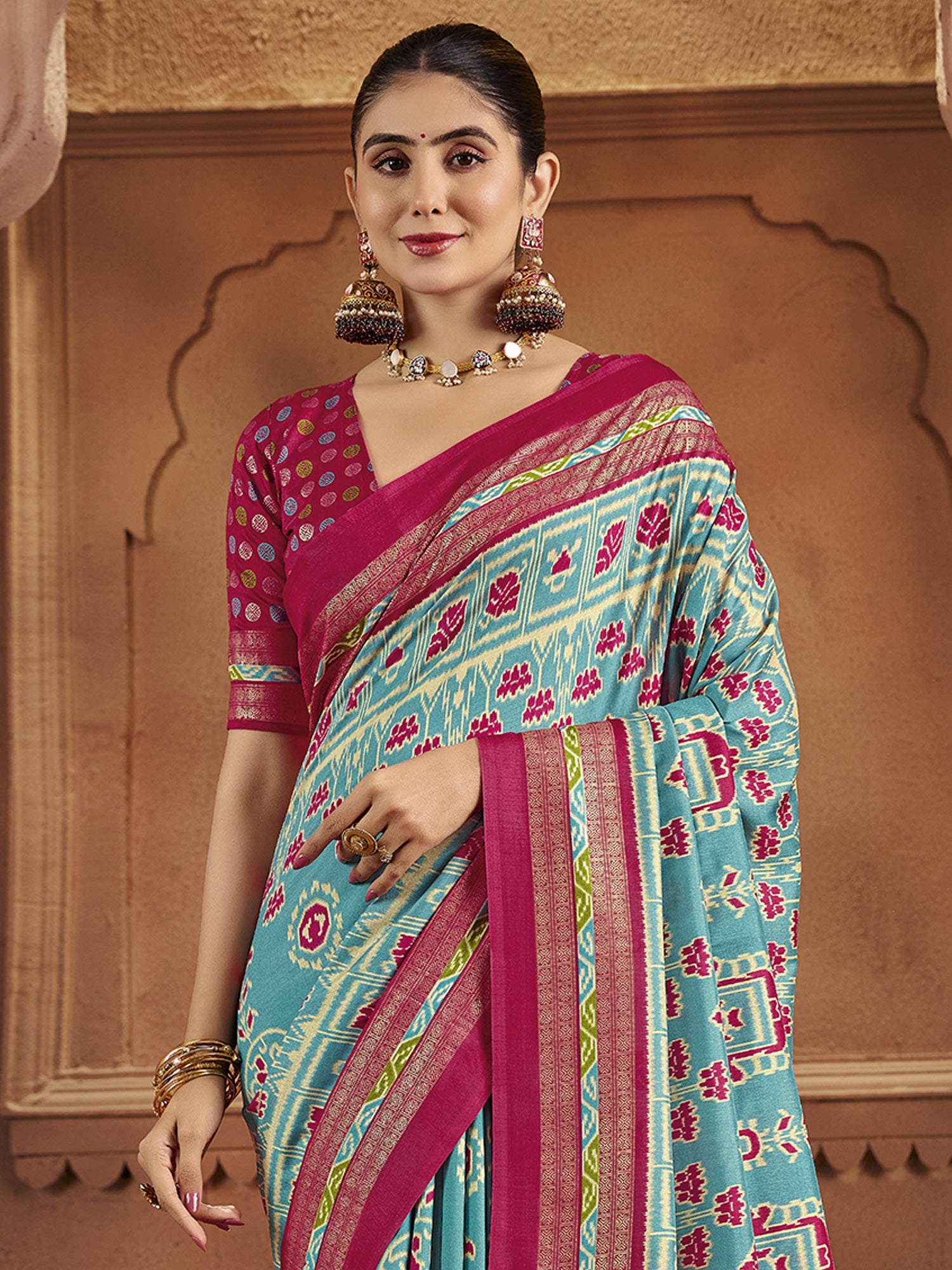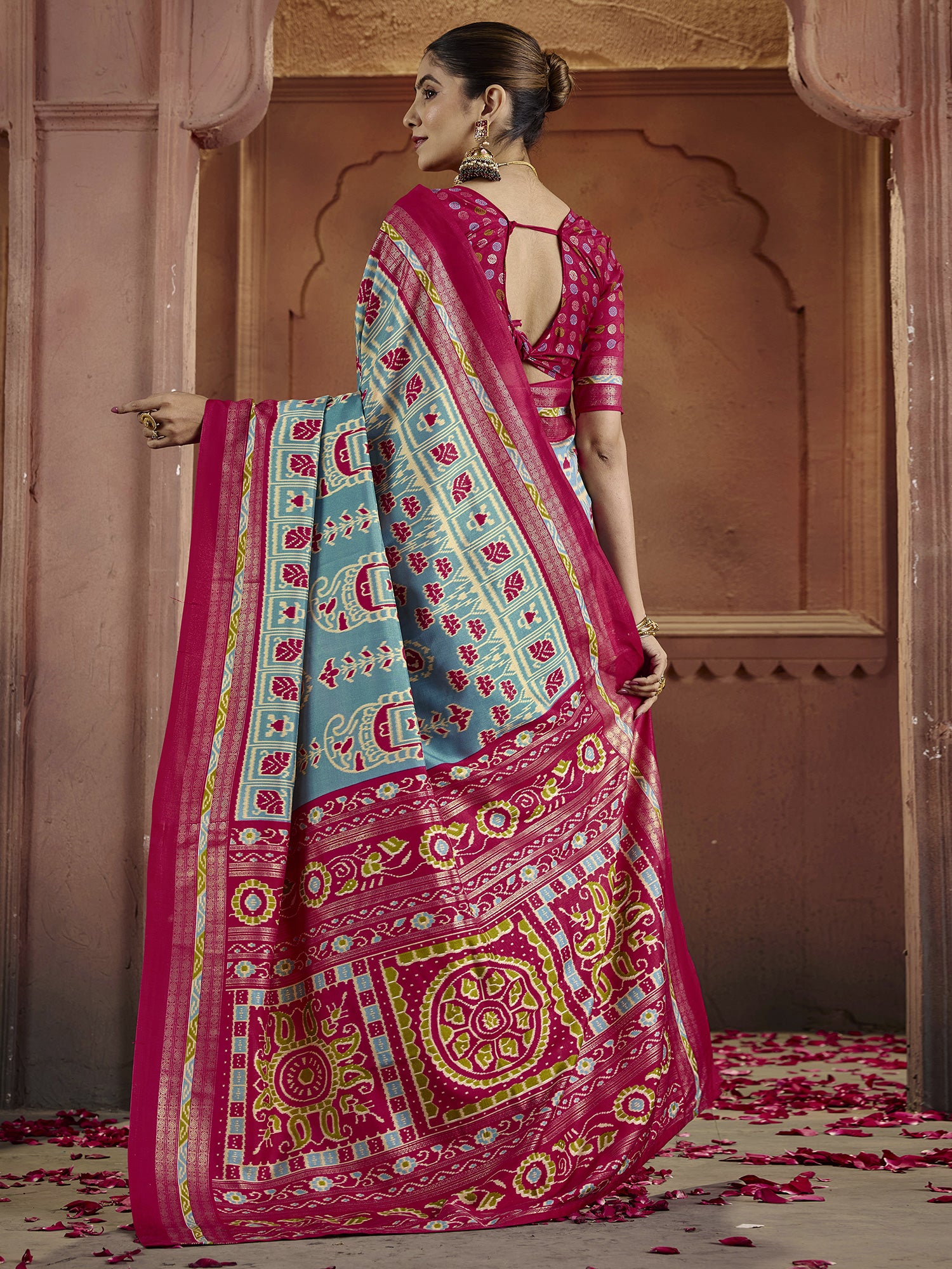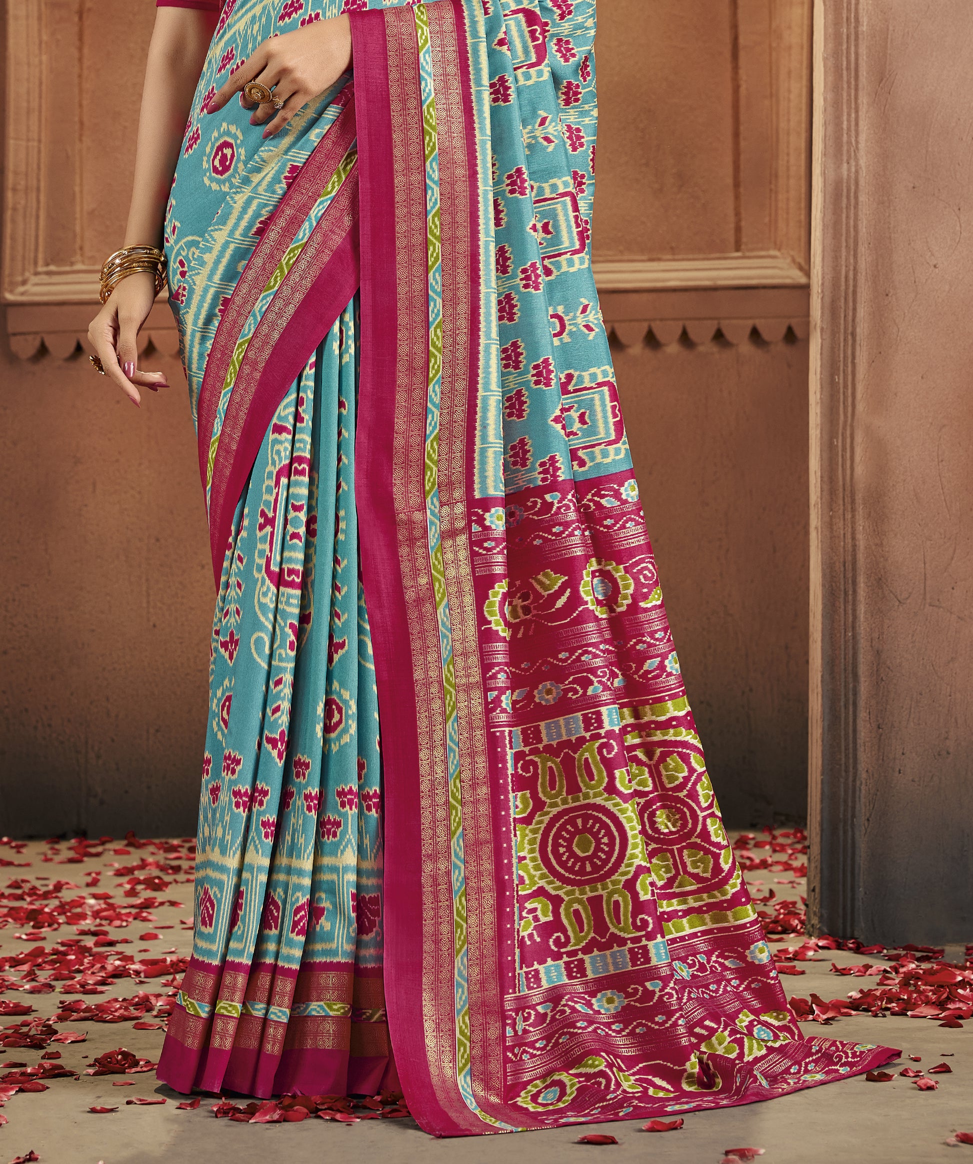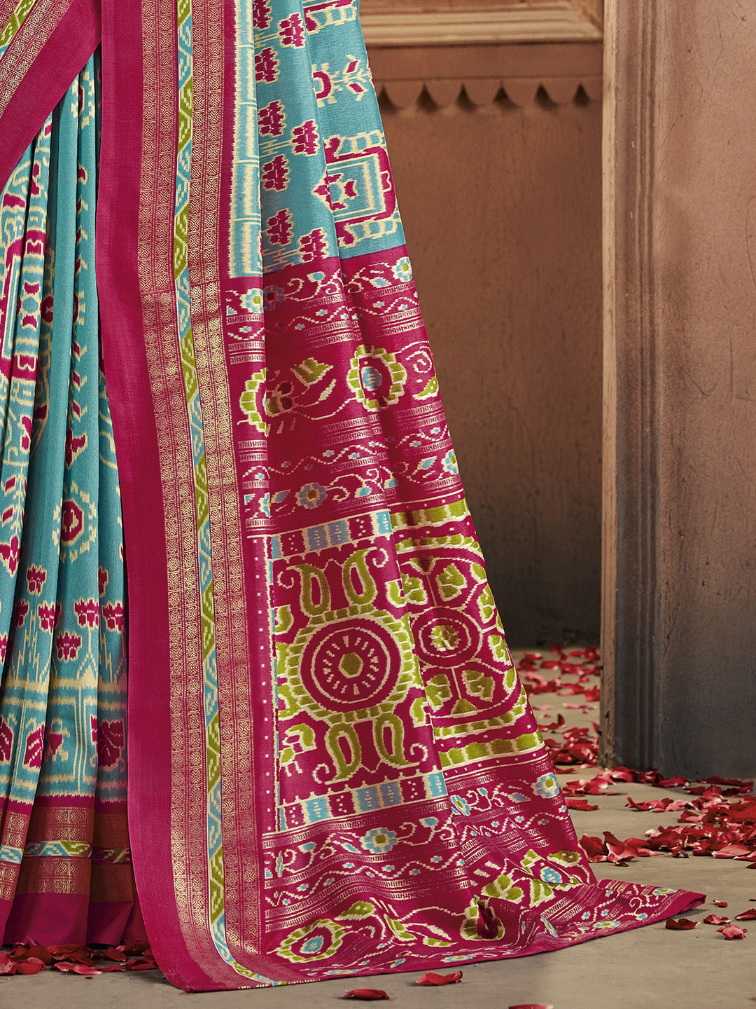 Patola Silk Saree — Sky Blue & Rani Pink Ikat Weave