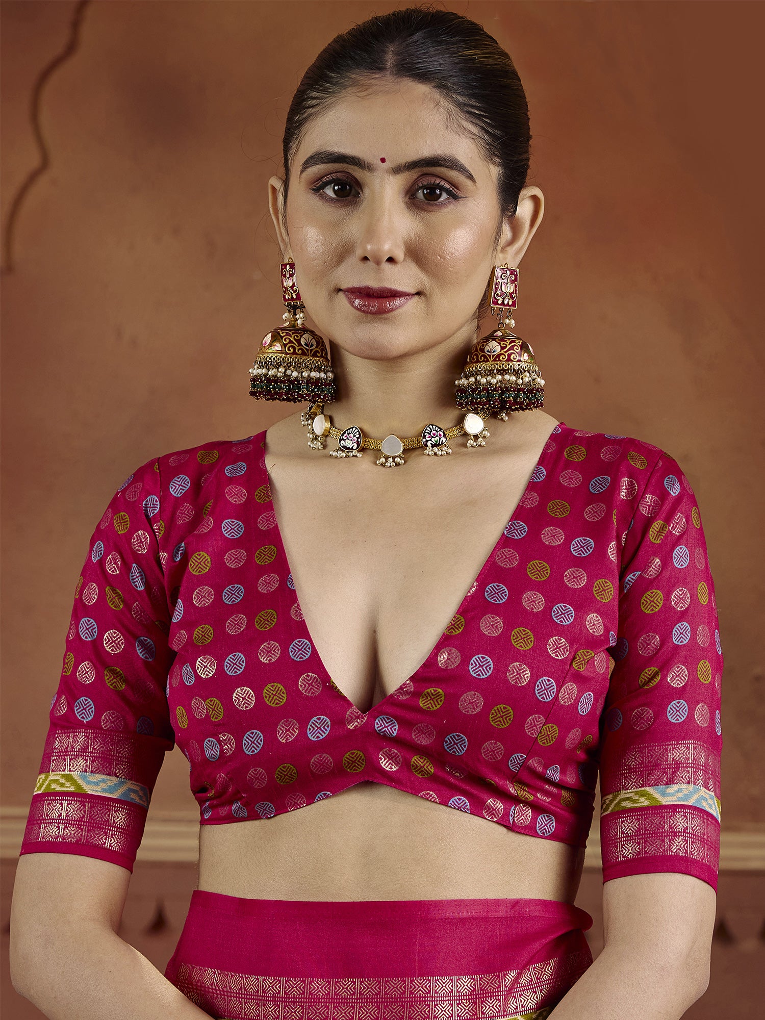 • Blouse: Matching rani pink silk blouse piece with woven buti (circular polka dot) pattern — ready to stitch