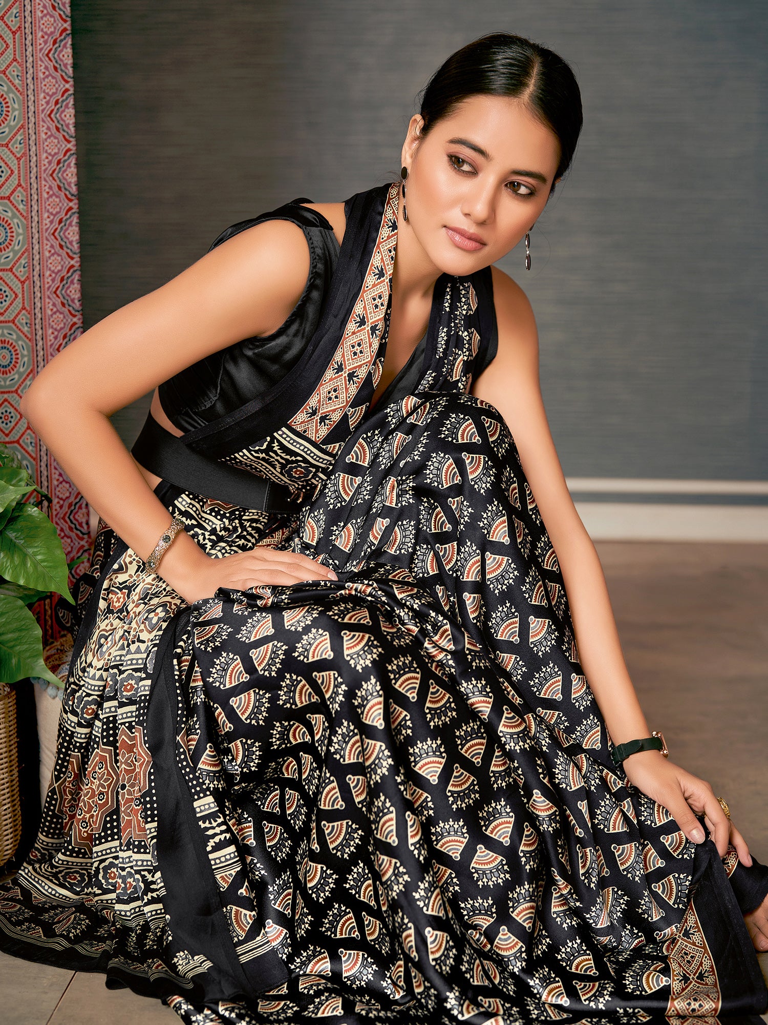 Black Ajrakh Silk Saree with Fan Motif Body, Block Print Pallu & Black Blouse