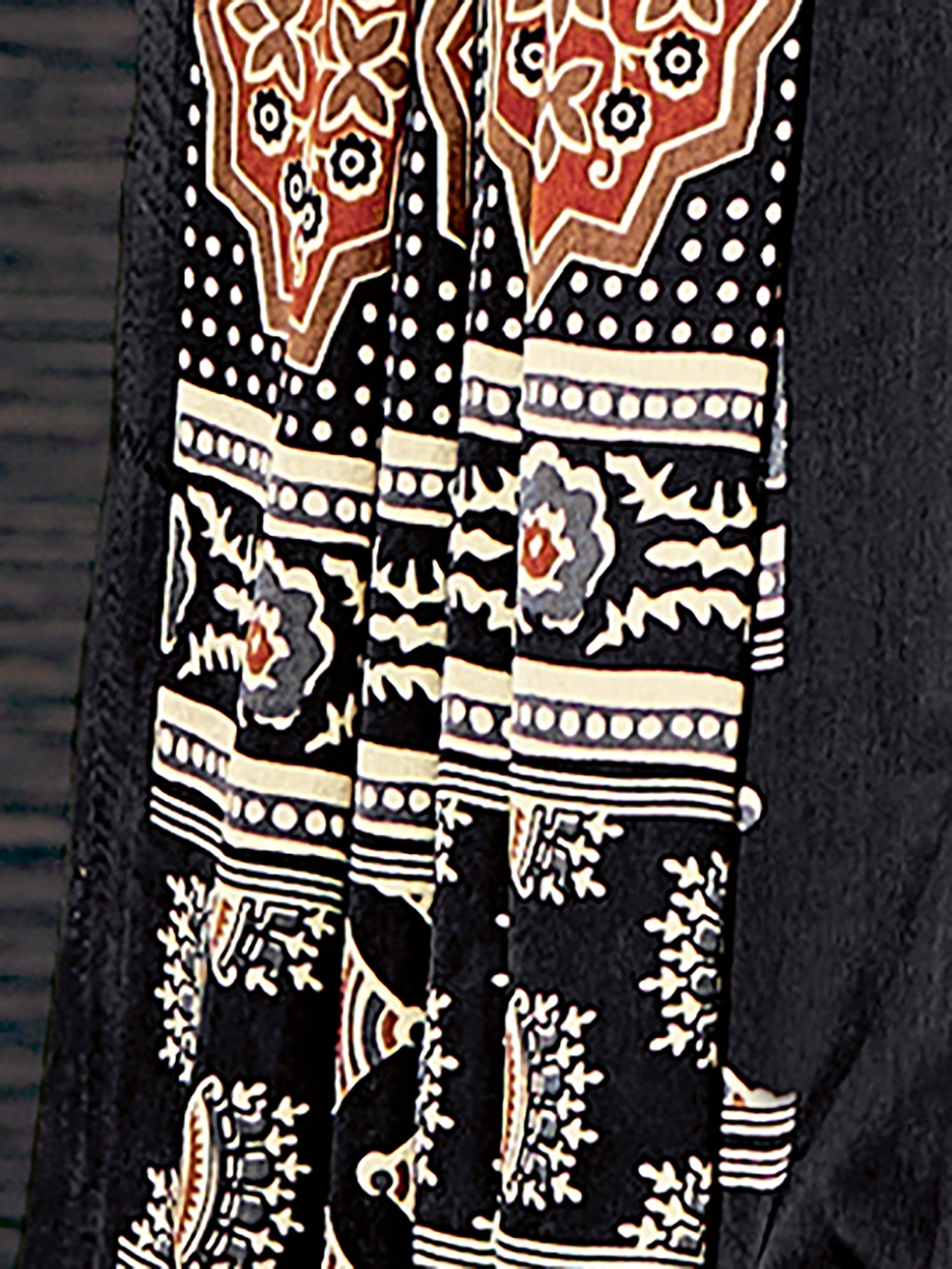 Dramatic, editorial, and deeply rooted in the ancient craft of Kutch Ajrakh — this black silk saree is a canvas of mesmerising fan / peacock tail motifs arranged in a dense all-over diagonal lattice. Each fan is a miniature masterpiece — concentric arcs in red, ivory, and grey with fine dot-work fills and tassel fringe tips — creating a rhythmic, jewel-like surface that shimmers with every movement.