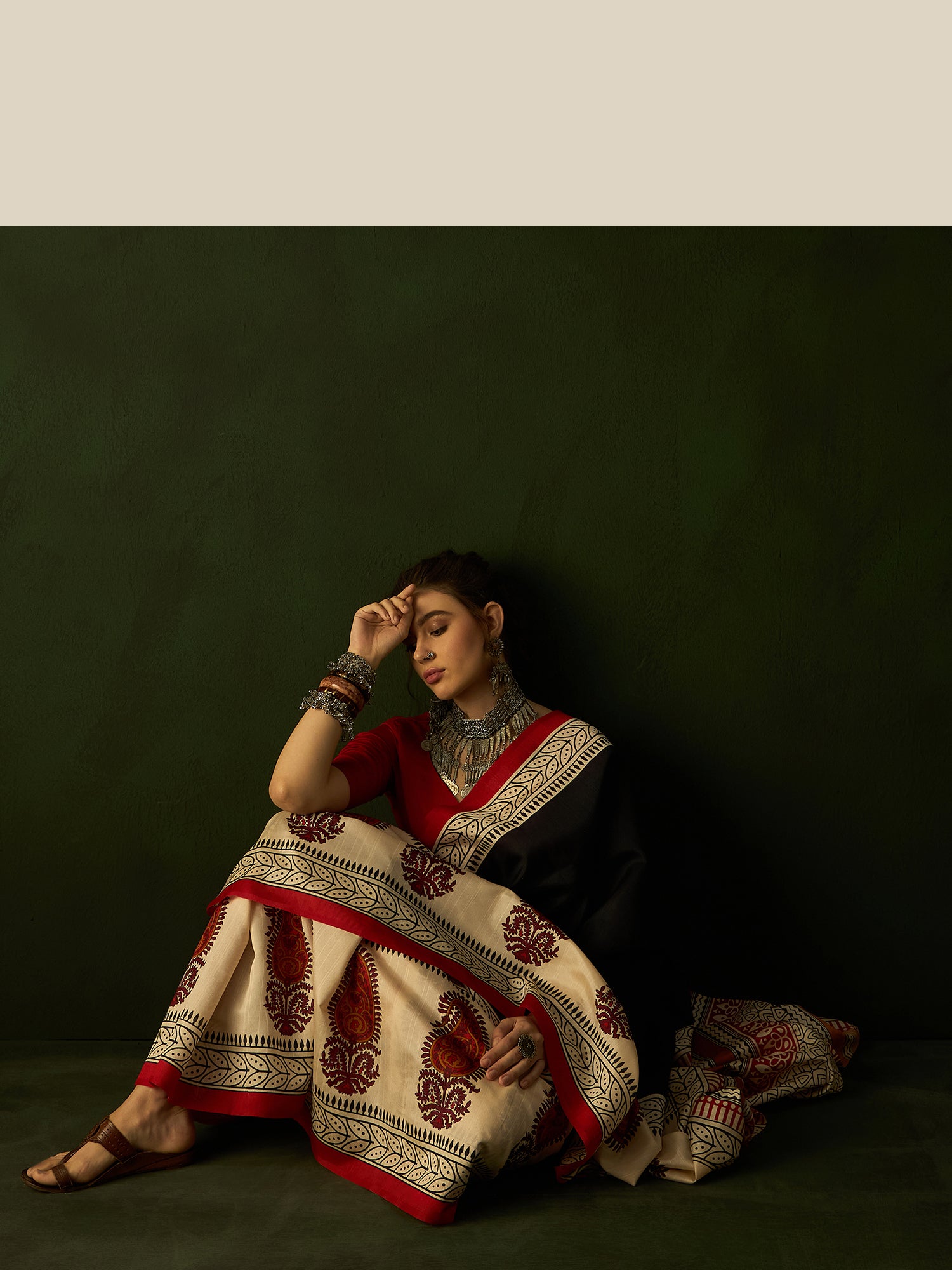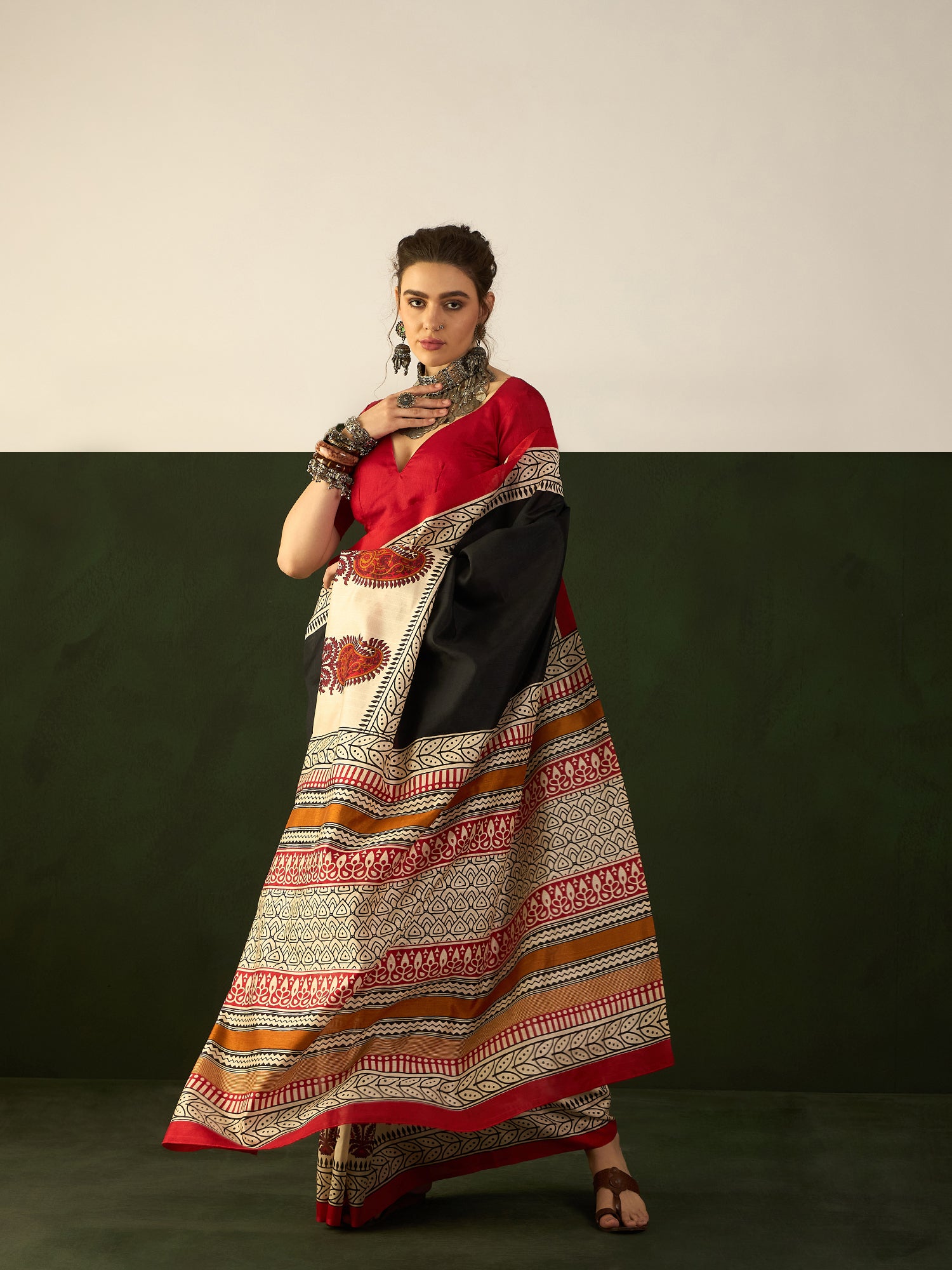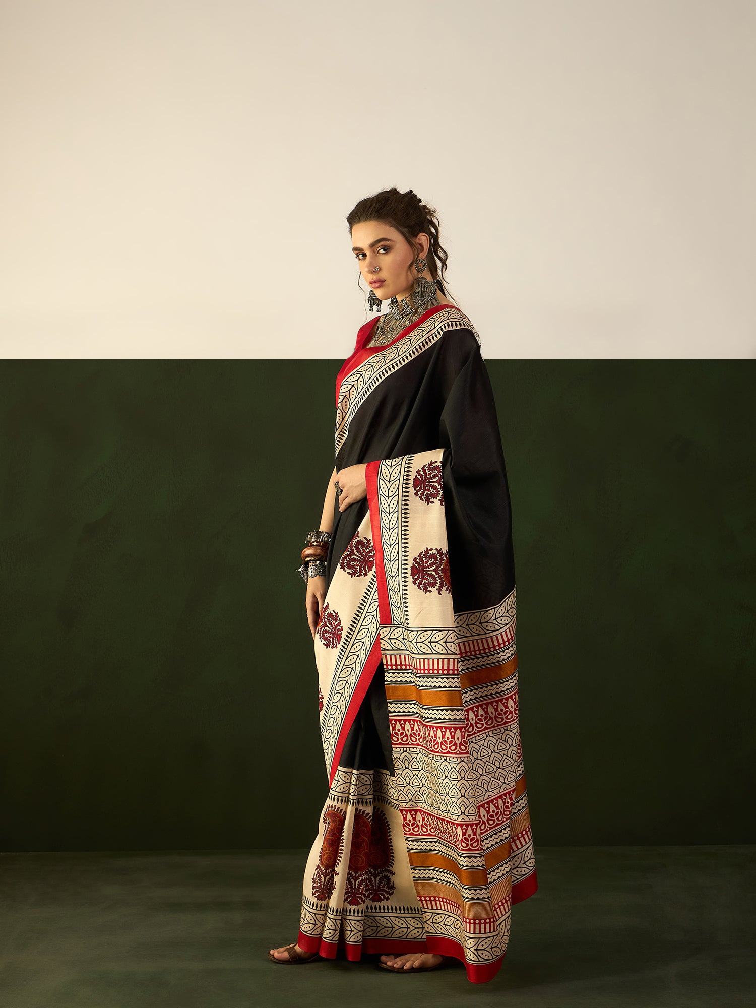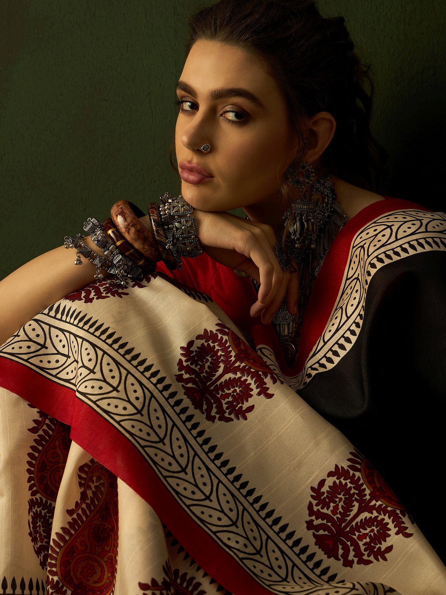 • Styled with bold oxidised silver layered choker necklace, large chandbali jhumkas, wide cuff bangles & cocktail ring