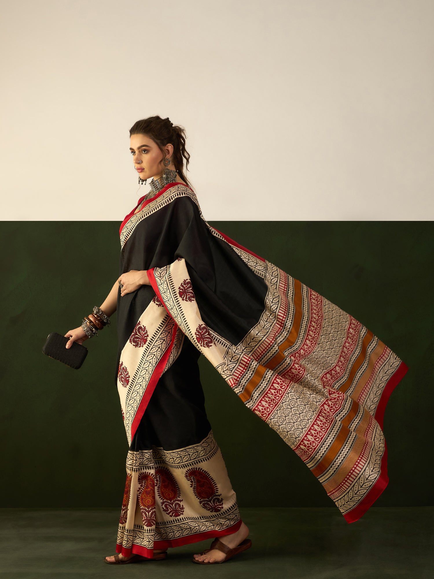 • Color: Midnight Black with Ivory Bagh Print Pallu & Crimson Red Border