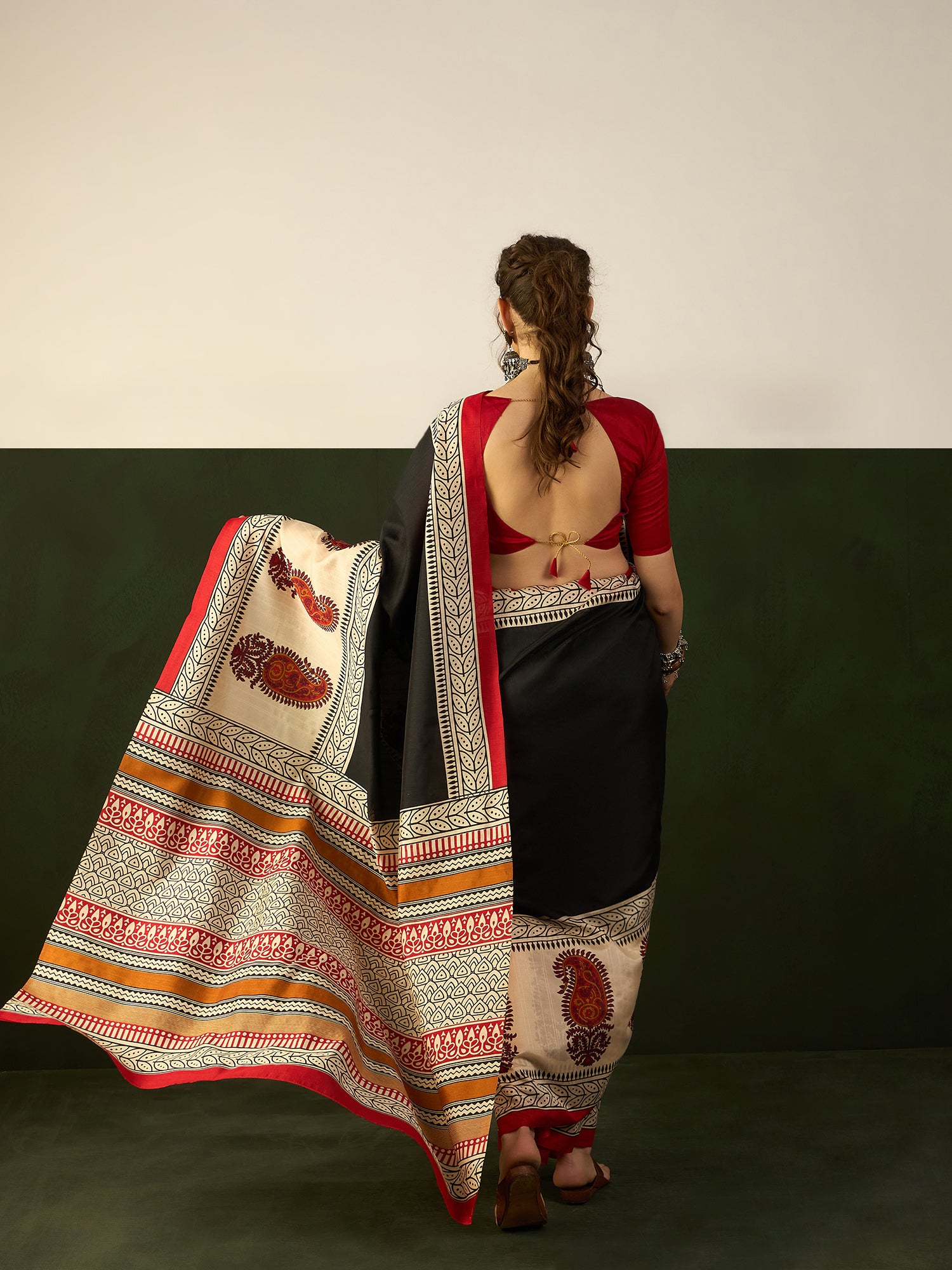 • Comes with a matching crimson red backless blouse with tassel tie-back detail — sensual, modern, and utterly elegant