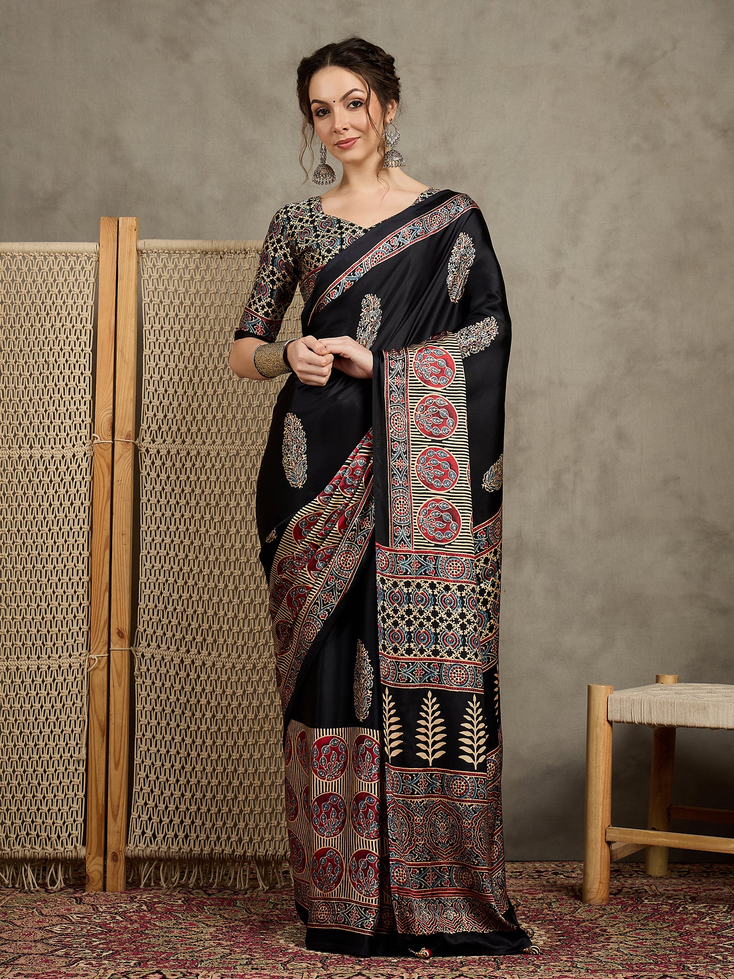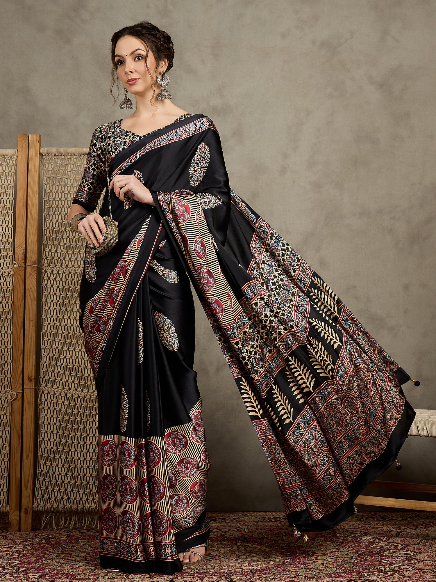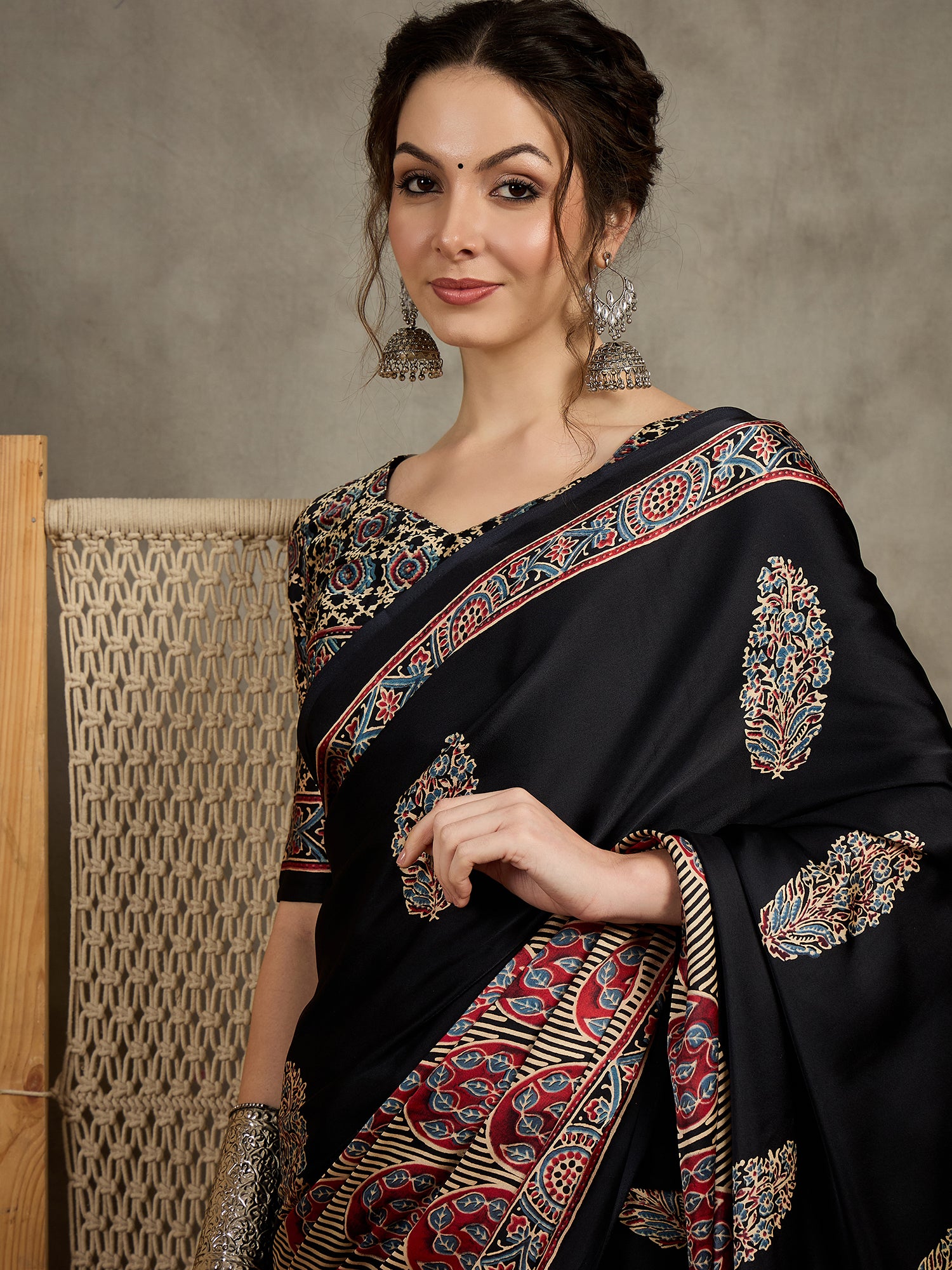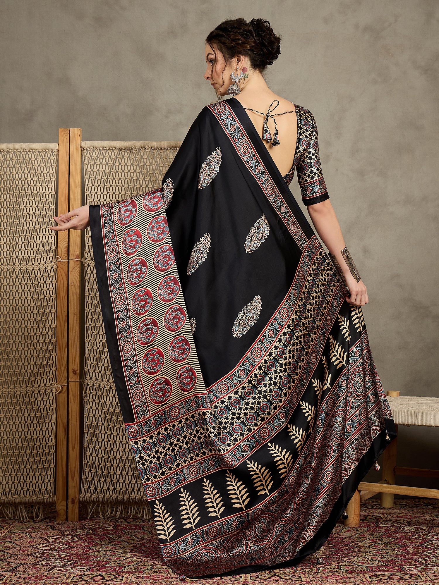 Classic Black-Red Printed Ajrakh Pallu Saree