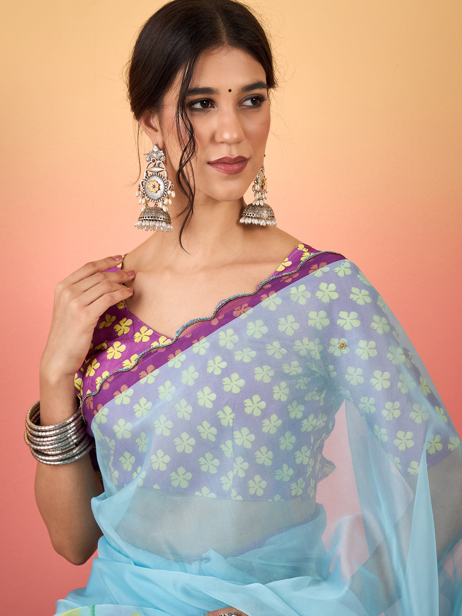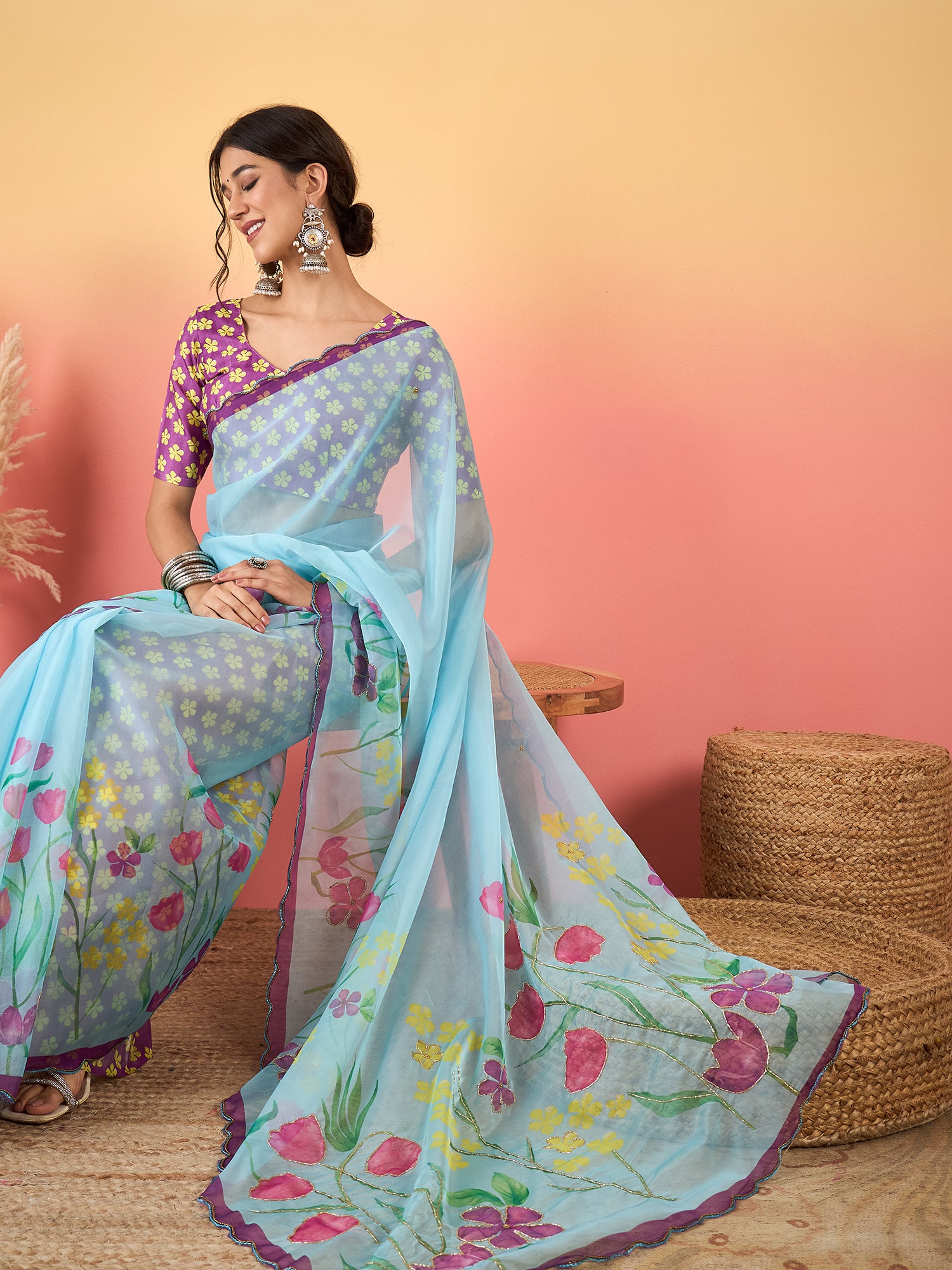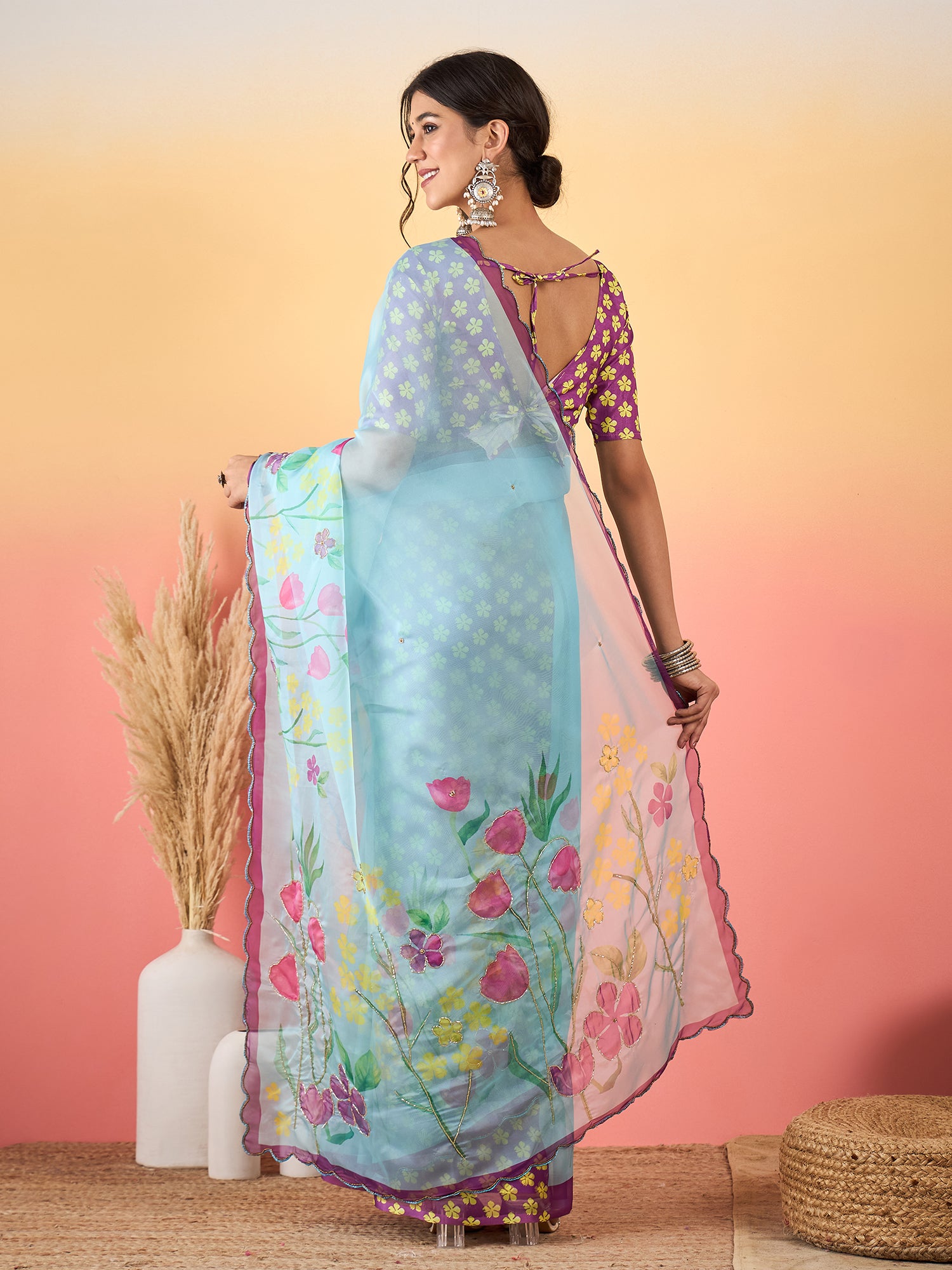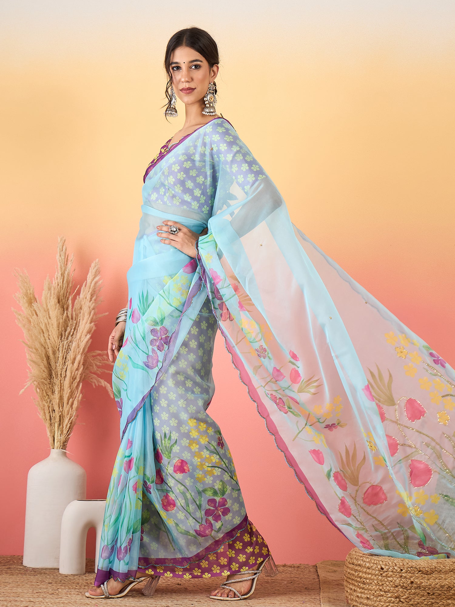 Elegant Sky Blue Beadwork Organza Saree